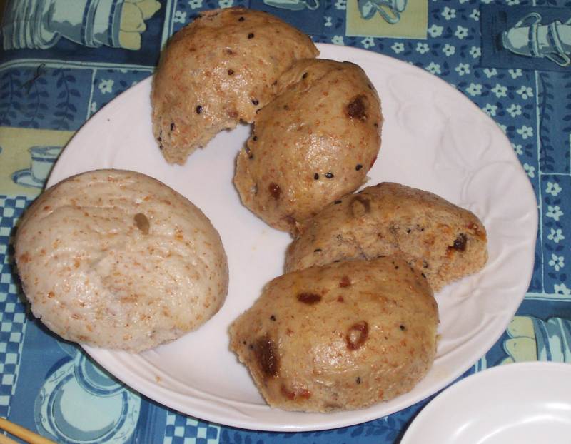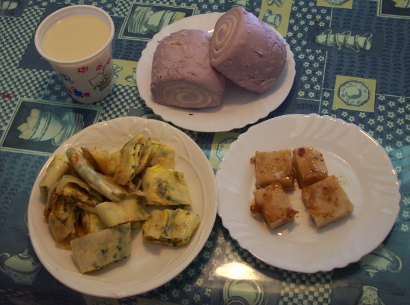 Breakfast FoodsSome of our favorite breakfast foods can be seen in the first picture. There is hot soy milk, danbing (scrambled egg with green onion rolled in a thin pancake), luobo gao 'white radish cake', and mantou (steamed buns). We can get this hot -- enough for our entire family -- from the local market for NT$78 (about US$2).