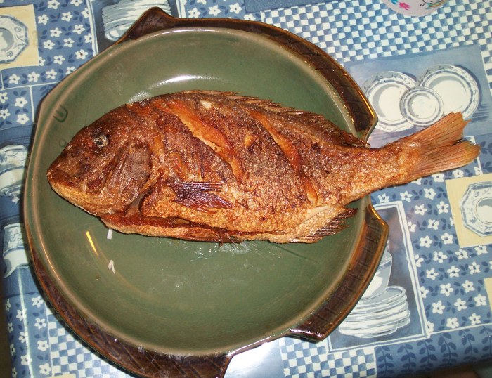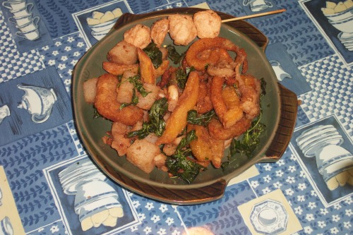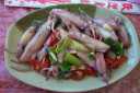 SeafoodSquid is very popular in Taiwan ... with good reason: it's yummy! Here is Clara eating fried squid, squid on a plate, and a squid-on-a-stick vendor. Fish is frequently cooked and served whole, steamed or (as in this photo) pan fried.