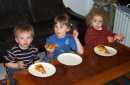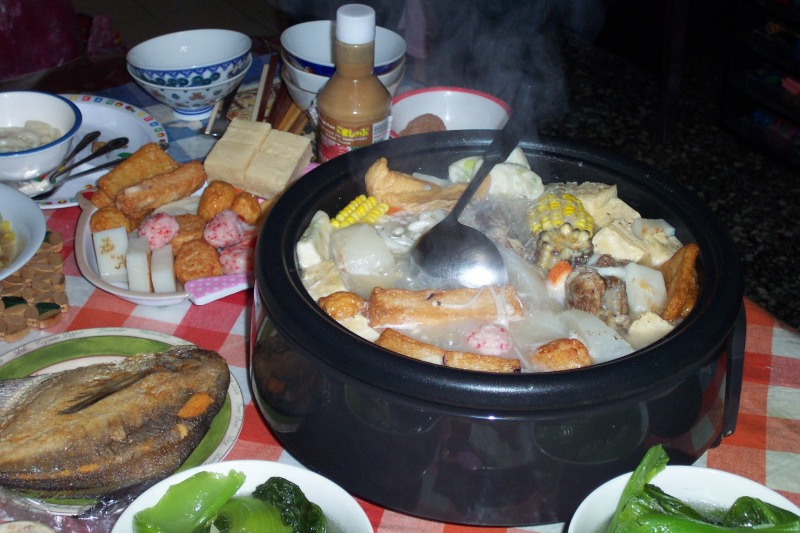 DinnerFrom left to right: deep-fried miscellany, hot-pot dinner at our friend's house, congyoubing ('onion-oil flatbread' -- much nicer than it sounds in translation!) and zongzi, wrapped and unwrapped. Zongzi are made of sticky rice filled with pork, peanuts, mushrooms, etc. and wrapped in bamboo leaves. They are traditionally eaten on the Dragon Boat Festival (Duanwu Festival).