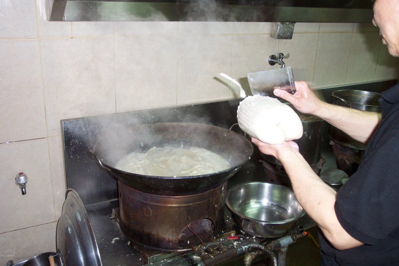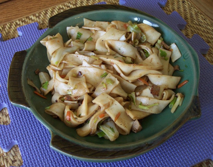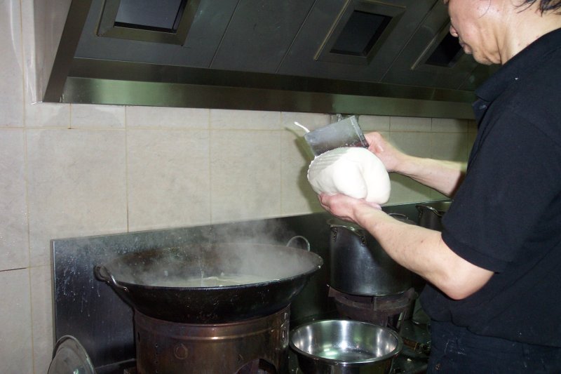 Here you see "knife-shaved" noodles being made by hand. This restaurant owner has been making these for 20 years at this location. Newell Ann was a regular patron here over a decade ago. The noodle dish on the plate is Van's favorite type of vegetarian noodles.