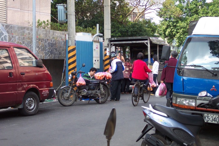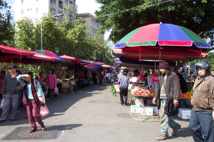 Around NankangPlease note the open-air market, the typical wall decoration (embedded broken glass), and the apartment building with the large chicken coop on the roof. Livestock on the roof is fairly common, even in the city.