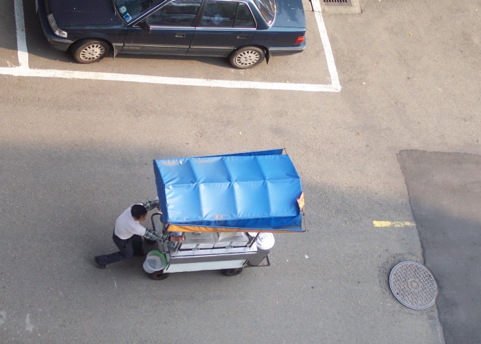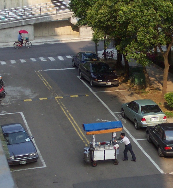 The View from our ApartmentHere you can see the park in front of our apartment, as well as the military post. The pushcart vendor is selling dou hua, which is soft tofu in a warm, sweet soup. The vendor sings out his arrival or plays a small stringed instrument.